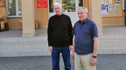 Knygos autoriai Albinas Jarmala (kairėje) ir Sigitas Birgelis šalia Punsko valsčiaus būstinės knygos atsiėmimo iš spaustuvės dieną.