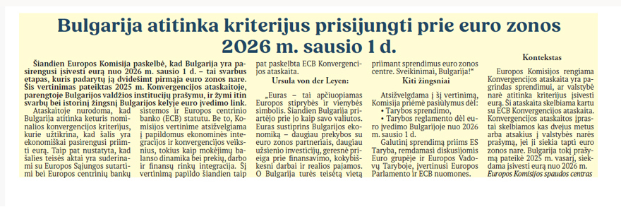 Bulgarija atitinka kriterijus prisijungti prie euro zonos 2026 m. sausio 1 d.